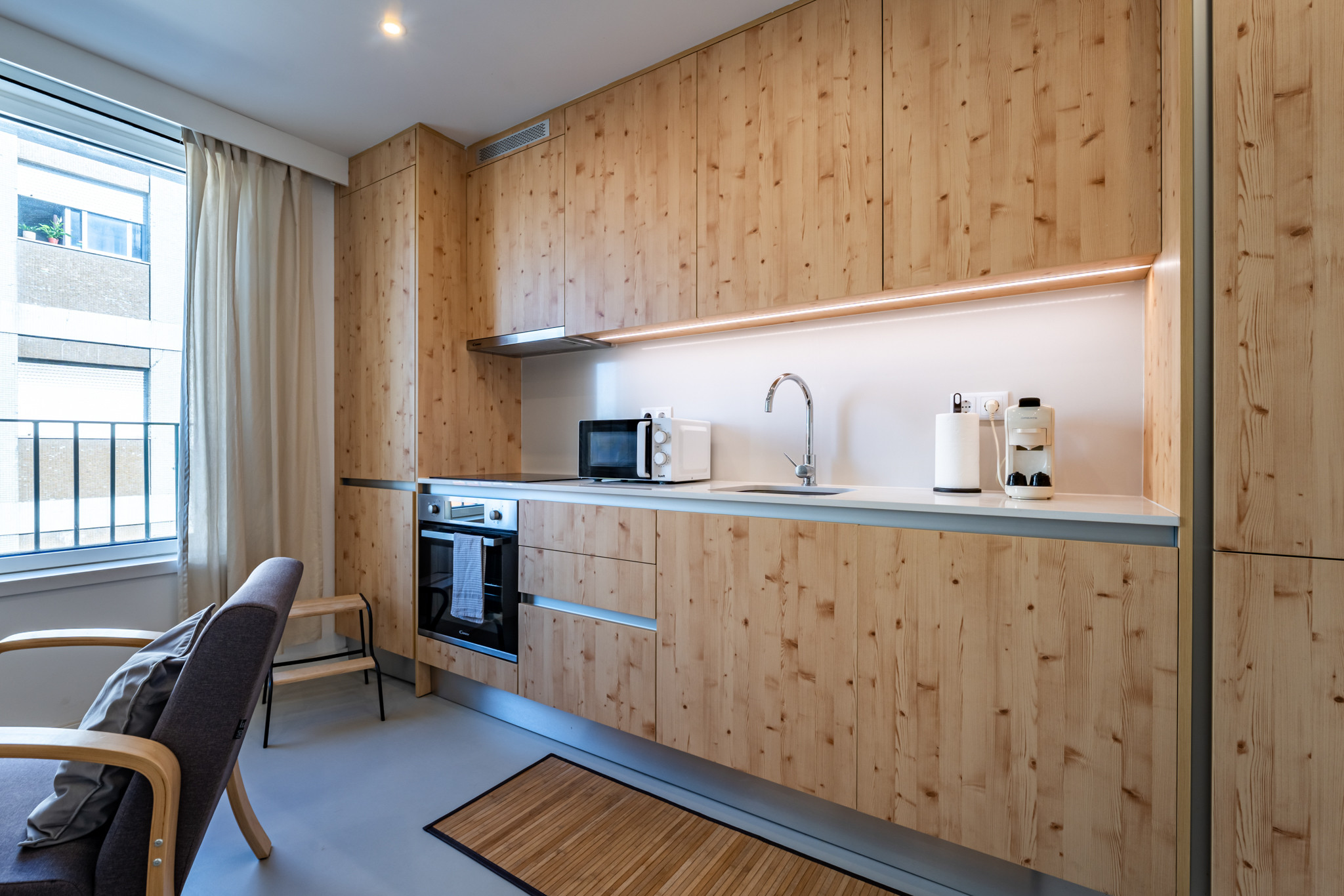 El estudio es acogedor, moderno y funcional: cama bien dimensionada y cómoda, kitchenette totalmente equipada, espacio de trabajo, Wi-Fi de alta velocidad, lavadora y lavavajillas. Todo está pensado para facilitar el día a día de profesionales en movilidad, estudiantes internacionales y nómadas digitales que buscan flexibilidad, serenidad y una excelente ubicación.