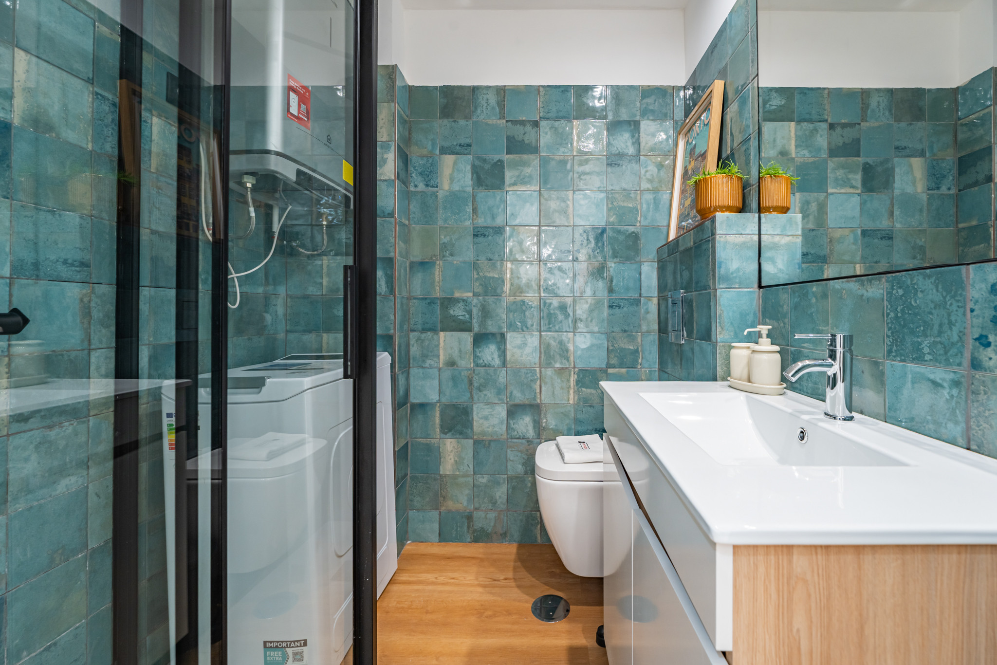 A máquina de lavar louça e a máquina de lavar roupa acrescentam autonomia às estadias mais longas, enquanto o ar-condicionado assegura conforto ao longo de todo o ano.