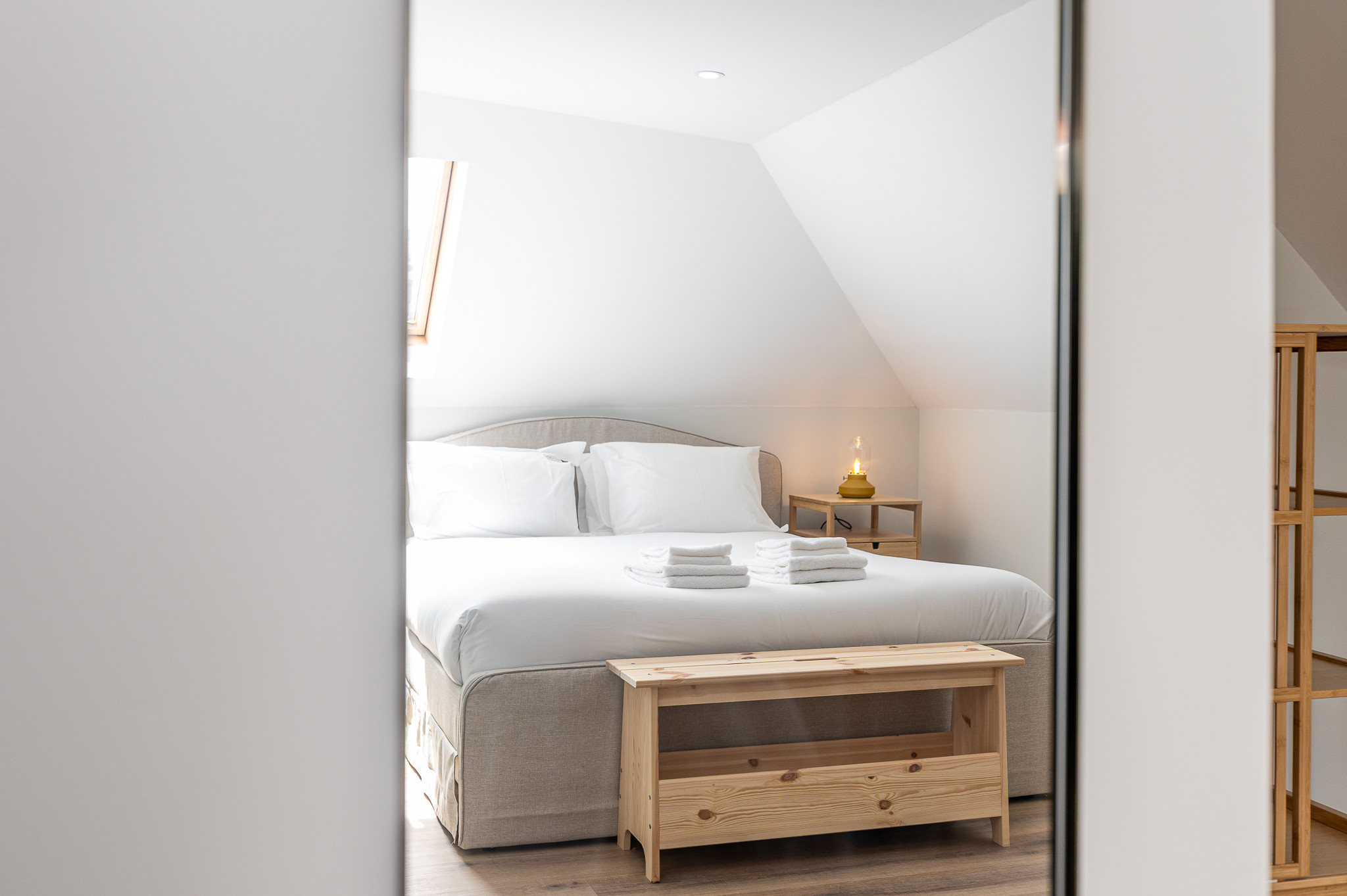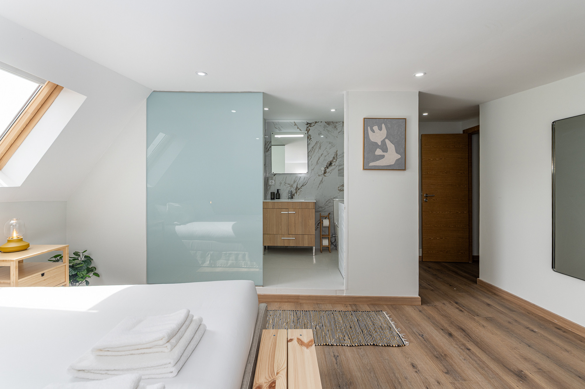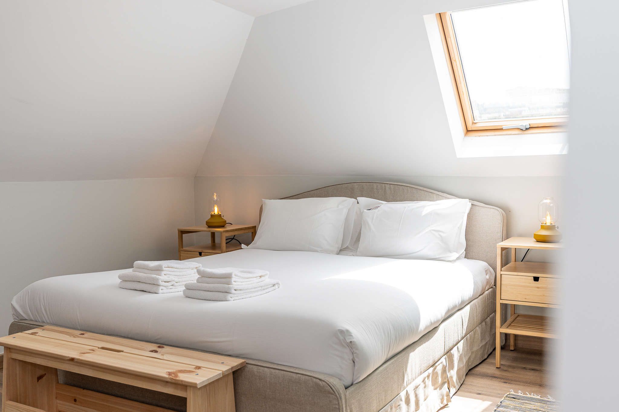 Distribuído por dois pisos, o apartamento dispõe de dois quartos, sendo um deles no piso superior, com vista para o rio, oferecendo uma perspetiva única sobre a cidade. A abundante entrada de luz natural ao longo de todo o dia reforça a sensação de amplitude e bem-estar em cada divisão. Com capacidade para até 4 pessoas, o espaço inclui ainda uma área dedicada de trabalho, ideal para estadias prolongadas e para quem trabalha remotamente.