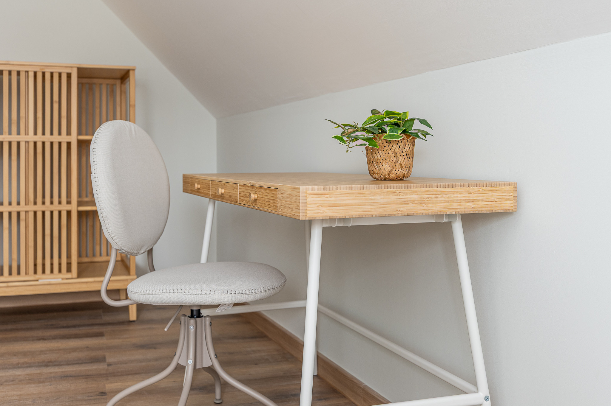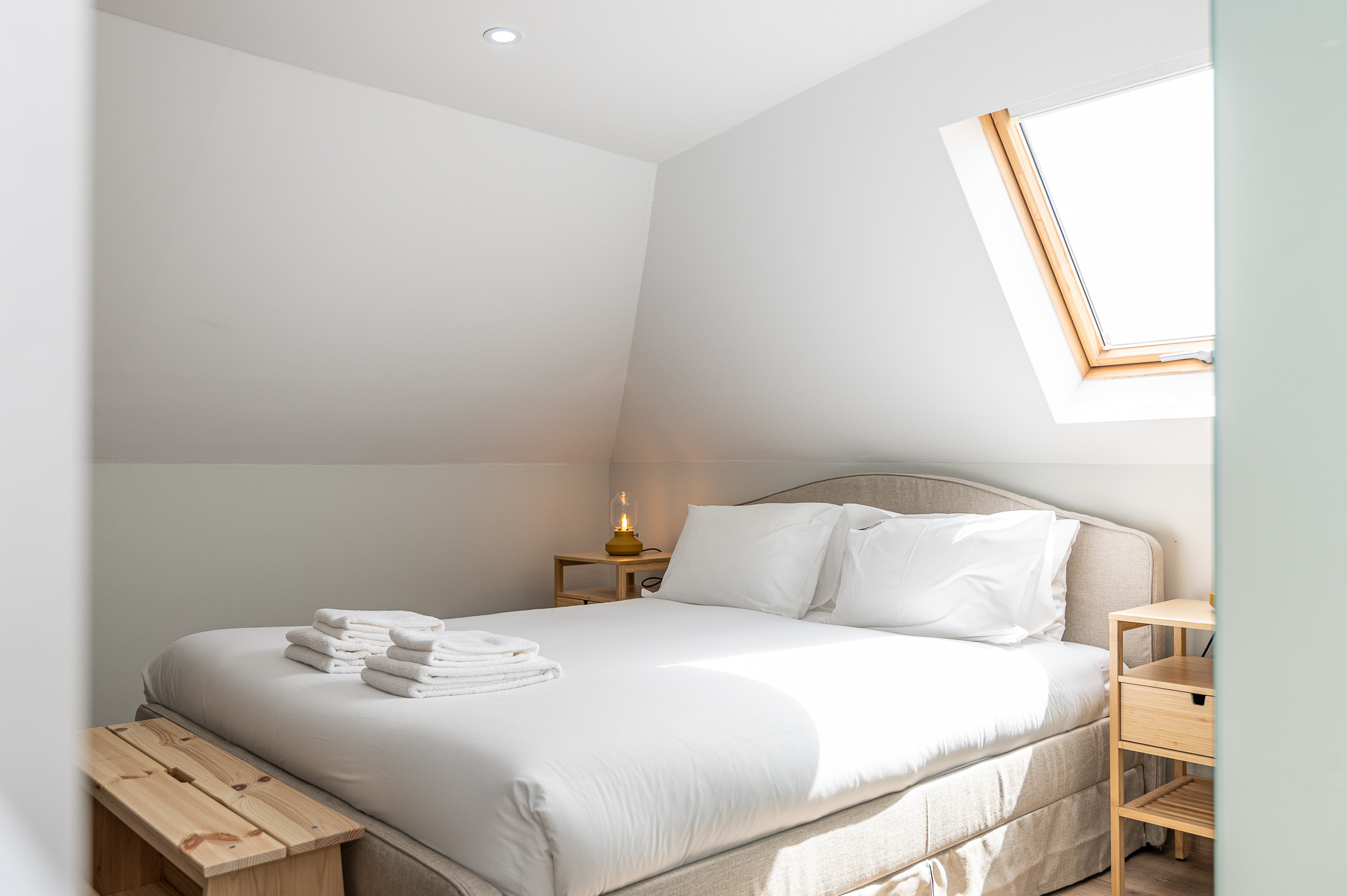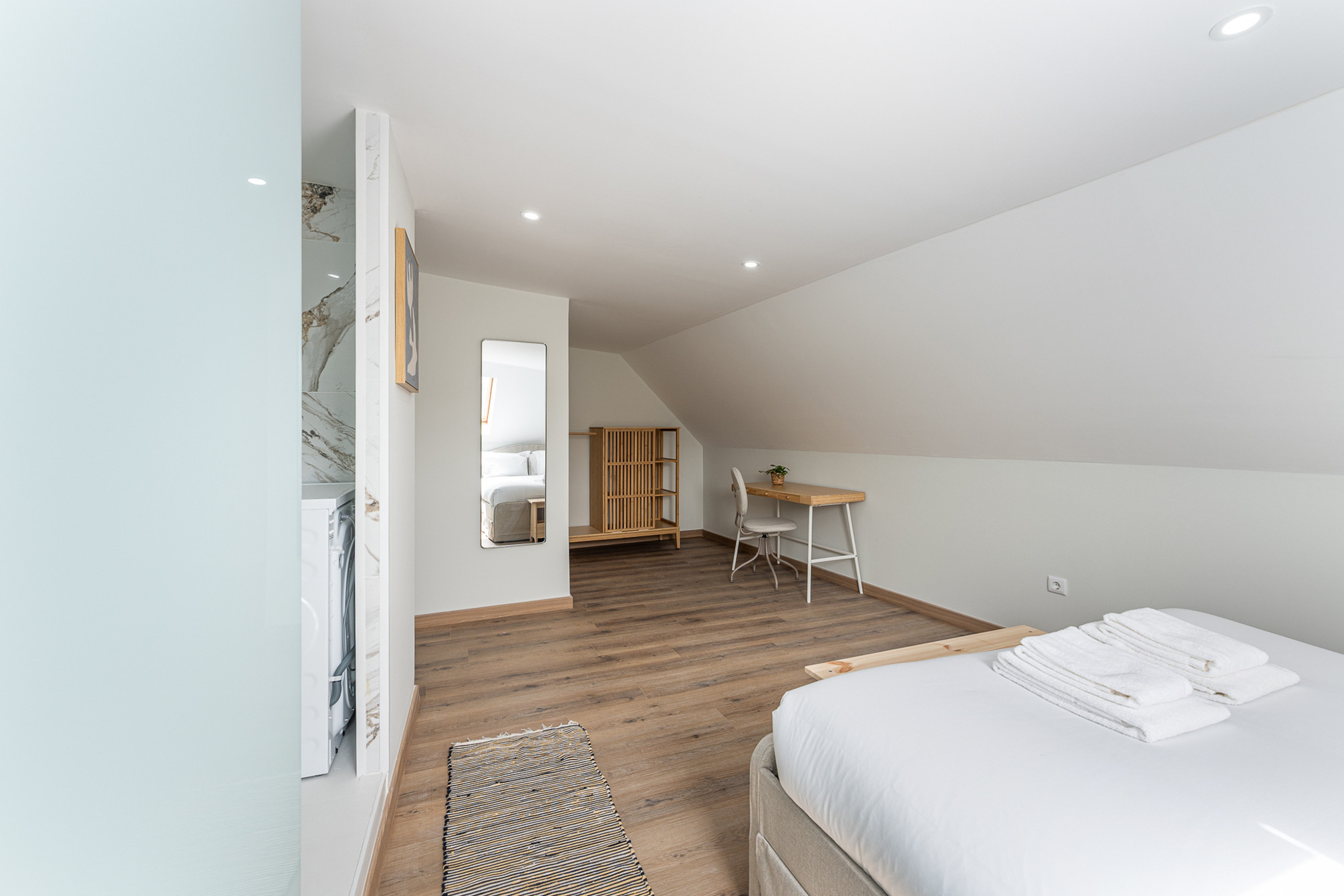 Distributed across two floors, the apartment has two bedrooms, one of which is on the upper floor, with a view of the river, offering a unique perspective over the city. The abundant natural light throughout the day reinforces the sense of spaciousness and well-being in each room. With capacity for up to 4 people, the space also includes a dedicated work area, ideal for extended stays and for those who work remotely.